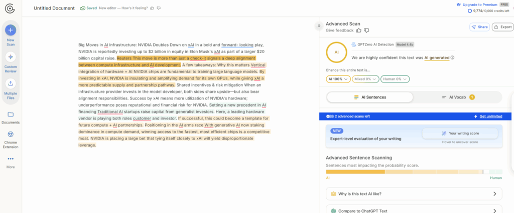 - Apart from giving a score, it also highlighted the AI-generated content.