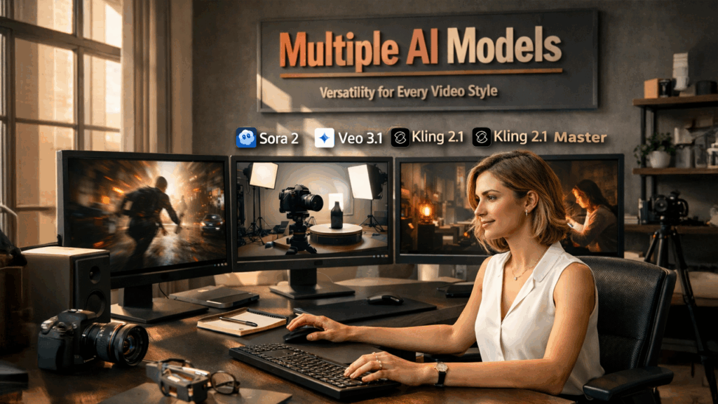 A notable feature of some AI video platforms is multi-model support. Distinct models ensure diverse strengths in realism, motion quality, and artistic style. For example, prominent models involve Veo 3.1, Sora 2, and Kling 2.1 Master, which can create cinematic visuals, creative storytelling, and realistic product presentations.
