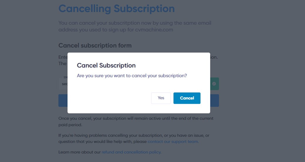 After you click on the Cancel Subscription button, a confirmation dialog box will appear asking, “Are you sure you want to cancel your subscription?”