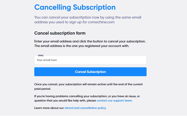 When you click on CV Machine Cancel Subscription, you will be taken to the cancellation page. There, you will find an option to enter your email address. Add the same email that you used to create your CV Machine account to successfully complete the cancellation process.