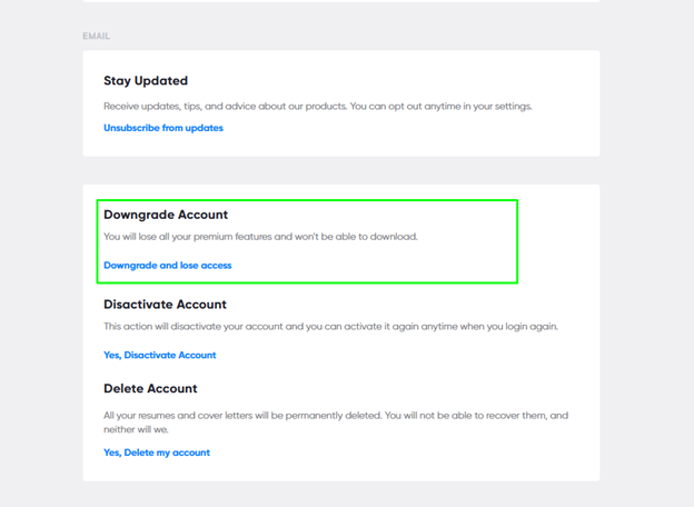 Inside Account Settings, scroll down to find the downgrade section. Click on "Downgrade and lose access"