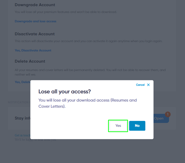 Just log back into your account and resubscribe before your current period expires if you accidentally cancel or decide to change your mind. Your work is secure even after cancellation because CV Machine does not immediately delete your account.