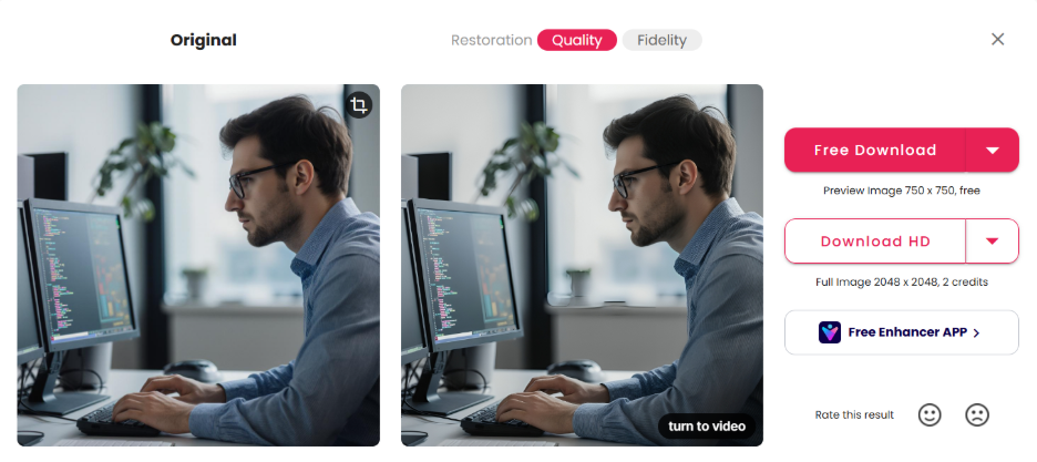 4. The system will instantly upscale and improve your image and both images will appear side-by-side on the screen.
