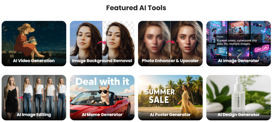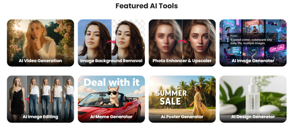 1. Select the option “Image Enhancer and Upscaler” from the “Featured AI Tools” section.