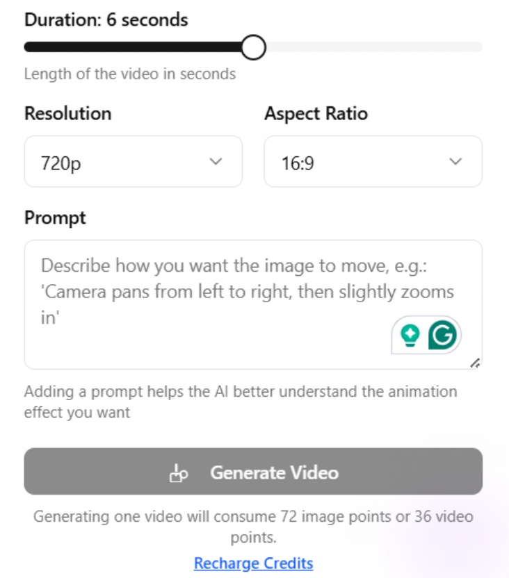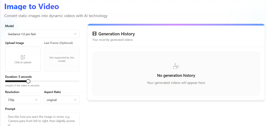 2. You will arrive at the dedicated “Image-to-Video" page, where you can see the side panel that you can use to customize the image.