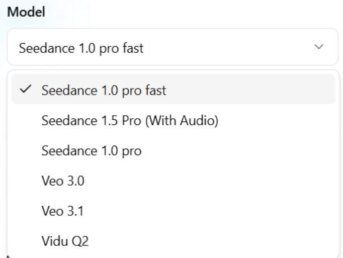 3. First, you need to select the model. You can choose among the options such as Seedance 1.0, Seedance 1.5 Pro (With Audio), Veo 3.1, Vidu Q2, etc.