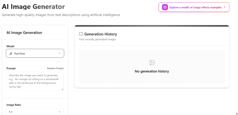 • Provide your prompt, choose the image ratio, and hit “Generate.”