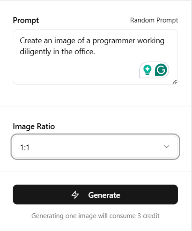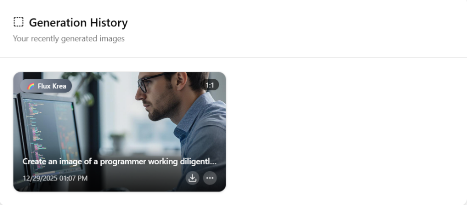 • The generated image will appear in the “Generated History” section on the right-hand side. For demonstration, the prompt given in this instance is as follows: “Create an image of a programmer working diligently in an office.”