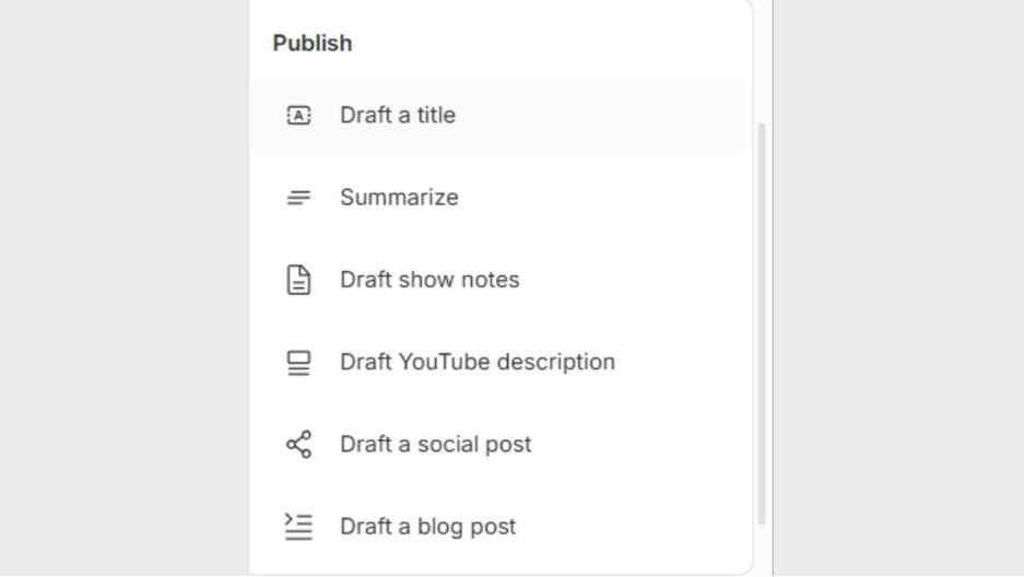 D) Publish: You can create content for several channels based on the shared video content. In the publishing section, there are AI features to “Draft a Title,” “Draft a Blog Post,” “Draft Social Media Post,” “Draft YouTube Description,” etc. You can also use the “Summarize” option to create a summary of the YouTube video.