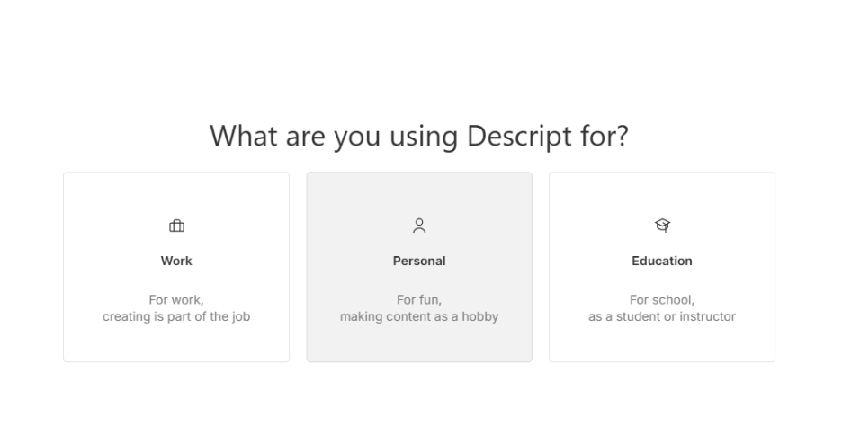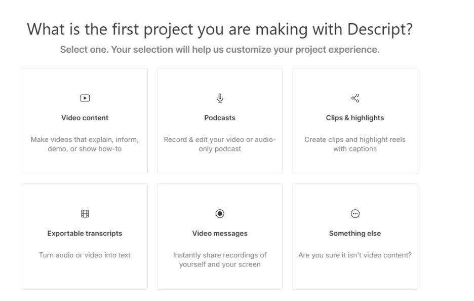 Select the type of project you want to work on with Descript. As this will be your first experience, make your choice carefully as this will aid the platform in customizing the user experience. We are choosing “Video Script” for the sake of the demonstration.