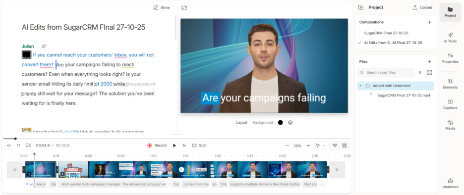 Underlord is an advanced AI assistant provided by the Descript platform. You can use it to automate any tasks related to video editing. Select the option present in the bottom right area of your screen. Test it by saying “Create the best version of this video” and see what it does.