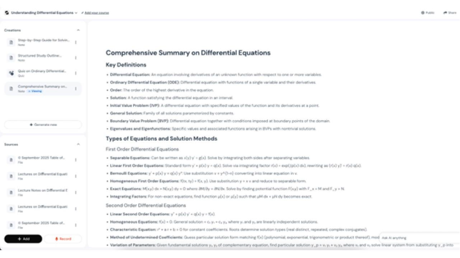 For instance, when studying the complex topic of Differential Equations, students may simply ask the tool for a complete summarized version of their notes in an easy-to-follow overview of the subject.
