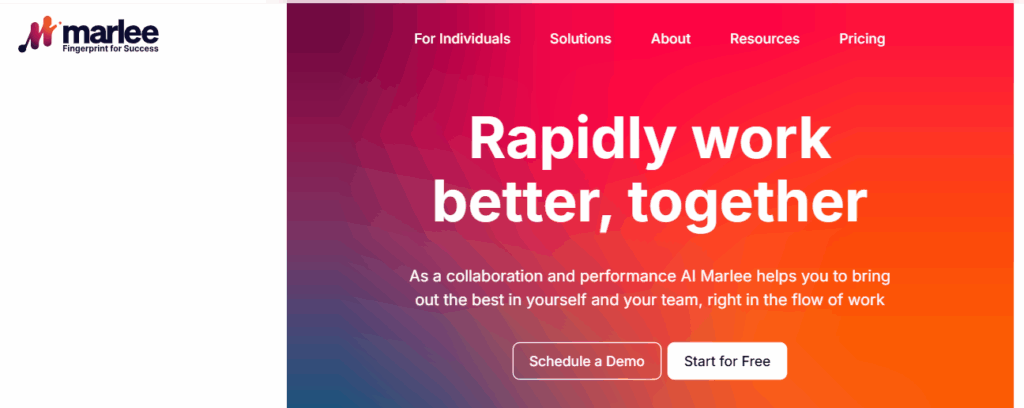 Marlee is a performance AI platform that helps teams collaborate better, stay motivated, and improve daily effectiveness. It delivers personalized coaching, motivation assessments, and actionable insights that make teamwork smoother and more aligned.