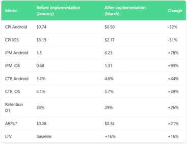 The results clearly showed: a 38% drop in CPI, a 54% higher CTR, and a 227% increase in conversion rate across campaigns.