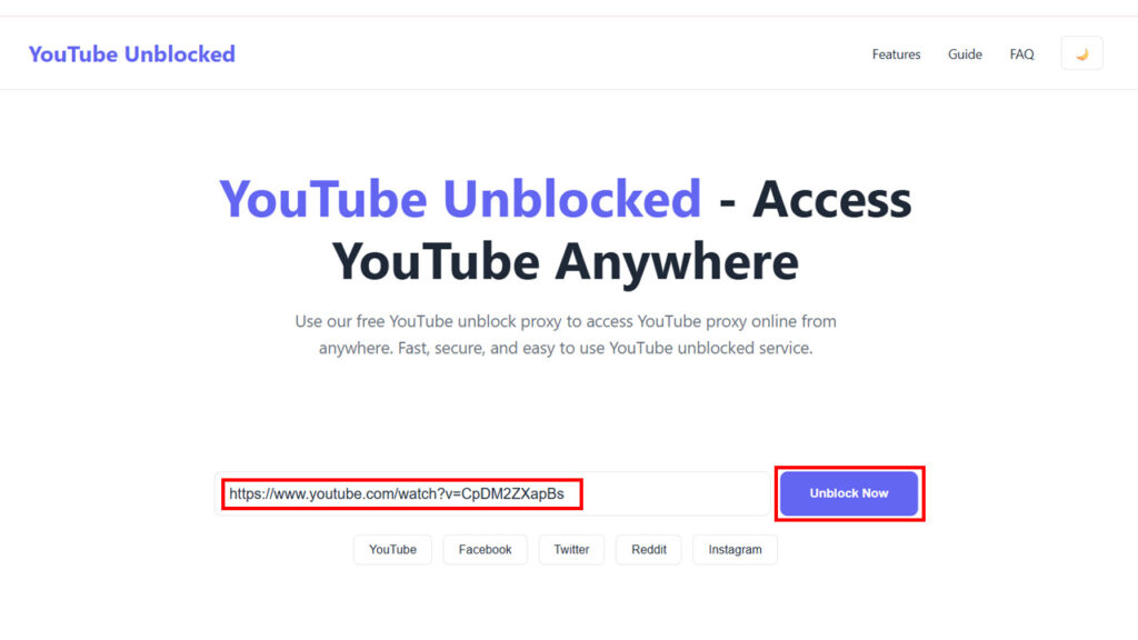 • Select the button titled "Unblock Now" to load the website through the YouTube Unblocked Proxy.